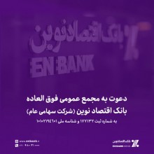 مجمع عمومی فوقالعاده بانک اقتصادنوین (شرکت سهامی عام) رأس ساعت ۱۰ صبح روز دوشنبه مورخ ۱۳۹۹.۰۲.۲۲ در تهران، خیابان ولیعصر، بلوار اسفندیار، شماره ۲۴، ساختمان مرکزی بانک اقتصادنوین، طبقه دهم تشکیل میشود.