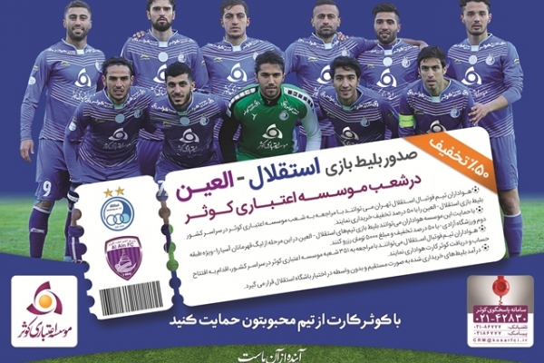 گفتنی است؛ دیدار استقلال تهران و العین امارات روز دوشنبه96/03/01 ساعت 20:45 در ورزشگاه آزادی تهران برگزار خواهد شد. همچنین بلیط فروشی (رزرو) دیدار استقلال و العین، فقط از طریق شعب موسسه اعتباری کوثر در سراسر کشور انجام می شود.