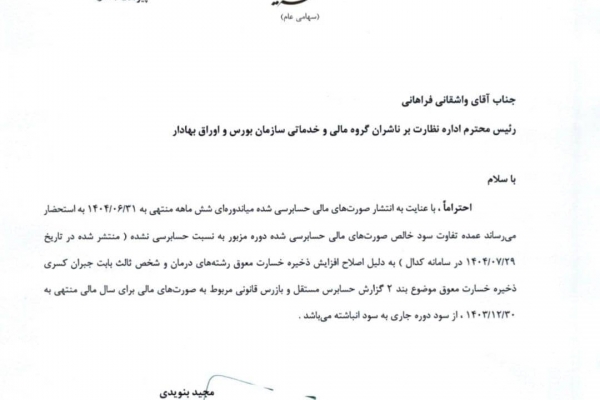 شرکت بیمه پارسیان دلیل تفاوت سود خالص صورتهای مالی حسابرسی شده دوره 1404.06.31 به نسبت (حسابرسی نشده ) منتشر شده در تاریخ 1404.07.29 در سامانه کدال را اعلام کرد.