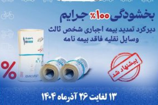 بر اساس این پیشنهاد، کلیه جرایم بیمه نامه شخص ثالث (دیرکرد تمدید) برای تمامی وسایل نقلیه فاقد بیمهنامه در صورت تهیه بیمه نامه یکساله، از تاریخ ۱۳ آذر (روز بیمه) تا ۲۶ آذر (روز حمل و نقل و رانندگان) و به مدت ۱۴ روز مورد بخشودگی قرار خواهد گرفت؛ نهایی شدن این پیشنهاد، منوط به سیر مراحل قانونی و تایید رییس مجمع صندوق و وزیر امور اقتصادی و دارایی است و در صورت موافقت، در زمان مقتضی، اجرایی و اطلاع رسانی خواهد شد.