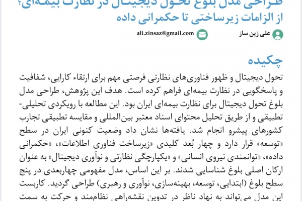 زین‌ساز در ارائه مقاله خود، مدل مفهومی پنج‌سطحی بلوغ تحول دیجیتال در نظارت بیمه‌ای ایران را معرفی کرد؛ مدلی که چهار بُعد اصلی شامل زیرساخت فناوری اطلاعات، حکمرانی داده، توانمندی نیروی انسانی و یکپارچگی نظارتی و نوآوری دیجیتال را در بر می‌گیرد و مسیر ارتقای نظارت دیجیتال را در ایران ترسیم می‌کند.