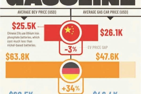 تصویر روبهرو، این شکاف عظیم میان چین و غرب را به تصویر میکشد. درحالیکه در چین (دایره قرمز)، خودروهای برقی بهطور متوسط ۲۵.۵ هزار دلار قیمت دارند (ارزانتر از ۲۶.۱ هزار دلار بنزینی)، در آلمان و آمریکا، خودروهای برقی همچنان بیش از ۳۰ درصد گرانتر از همتایان فسیلی خود هستند. این تصویر بهوضوح نشان میدهد که «پریمیوم سبز» در چین به «تخفیف سبز» تبدیل شده است.