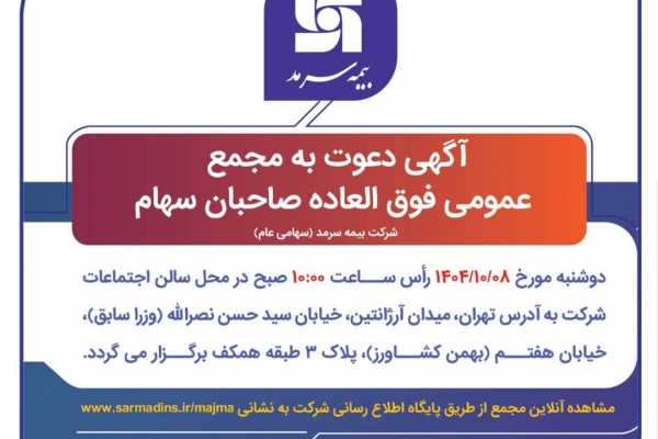 مجمع عمومی فوقالعاده صاحبان سهام بیمه سرمد(سهامی عام) به منظور تصمیمگیری درخصوص افزایش سرمایه، روز دوشنبه مورخ ۱۴۰۴/۱۰/۰۸ رأس ساعت ۱۰:۰۰ صبح در محل سالن اجتماعات شرکت به آدرس تهران، میدان آرژانتین، خيابان سید حسن نصرالله (وزرا سابق)، خيابان هفتم (بهمن کشاورز)، پلاک ۳ طبقه همکف برگزار میگردد.