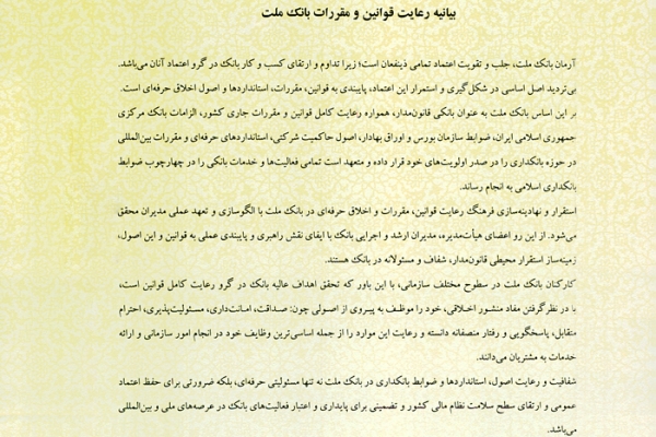 این گزارش حاکی است، بانک ملت با انتشار این بیانیه، پایبندی خود را به اصول شفافیت، پاسخگویی و رعایت قوانین و مقررات اعلام کرده است و انتظار دارد کارکنان در تمامی سطوح سازمانی، مفاد آن را به عنوان بخشی از تعهد حرفه ای خود مد نظر قرار دهند.