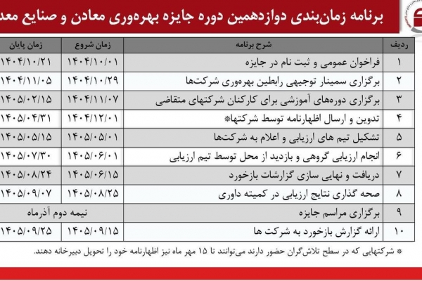 وی افزود: شرکت ها براساس آموزش های ارائه شده نسبت به تدوین اظهارنامه فعالیت های شرکت براساس مدل بهره وری معادن و صنایع معدنی اقدام خواهند کرد. پس از آن، تیمی از ارزیابان مجرب با حضور در شرکت‌ها نسبت به ارزیابی و تعیین سطح آنها اقدام خواهد کرد. در پایان نیز طی همایشی در نیمه دوم آذر 1405 با حضور مقامات رسمی، از عملکرد شرکت های برتر تقدیر خواهد شد.