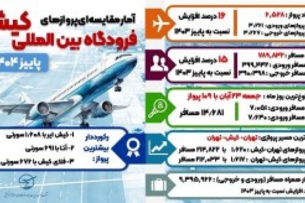 در سهماهه مهر، آبان و آذر ۱۴۰۴، مسیر تهران–کیش پرترددترین مسیر پروازی فرودگاه بینالمللی کیش بوده است. در این مسیر، یک هزار و ۶۲۰ پرواز ورودی و یک هزار و ۶۱۷ پرواز خروجی انجام شده و تعداد مسافران ورودی از تهران ۲۱۴ هزار و ۸۲۲ نفر و مسافران خروجی ۲۱۲ هزار و ۳۳ نفر گزارش شده است.