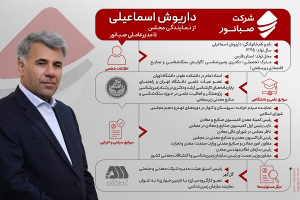 داریوش اسماعیلی از نیمه آبانماه؛ بهعنوان مدیرعامل این شرکت منصوب شده و از آن زمان تا کنون نقش مهمی در هدایت و پیشبرد پروژهها و اهداف صبانور ایفا کرده است. وی علاوه بر فعالیتهای اجرایی در صبانور، سابقهای برجسته در عرصههای علمی، اجرایی و تقنینی دارد.