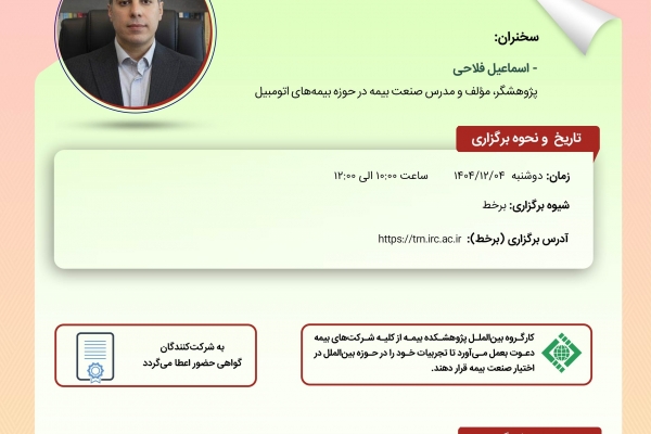 در این کارگاه، شرکتکنندگان با مفاهیم پایه، روندهای جهانی، مزایا و چالشهای این نوع پوشش آشنا میشوند و همچنین ارتباط آن با ساختار بیمههای اتومبیل در کشور مورد بررسی قرار میگیرد.