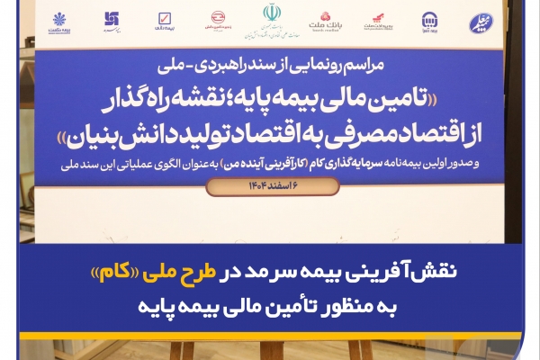 آیین رونمایی از سند راهبرد ملی «تأمین مالی بیمه پایه؛ نقشه راه گذار از اقتصاد مصرفی به اقتصاد تولید دانش‌بنیان» موسوم به طرح ملی «کام» برگزار شد؛ طرحی که به‌عنوان فصل جدیدی از تعامل صنعت بیمه با زیست‌بوم فناوری و نوآوری کشور معرفی شده و با هدف ایجاد سازوکاری پایدار برای تأمین مالی بیمه پایه آحاد جامعه طراحی شده است.