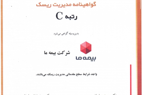 شرکت بیمه "ما" موفق شد ، گواهینامه (سطح  C) در مدیریت ریسک را از ((مرکز رتبه بندی مدیریت ریسک )) انجمن حرفه ای صنعت بیمه در یافت کند.