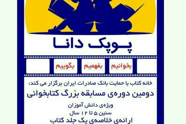 مهلت ارسال آثار به دومین دوره مسابقه بزرگ کتابخوانی «بخوانیم، بفهمیم، بگوییم» با عنوان «پوپک دانا» تا شانزدهم مهر ماه همزمان با روز جهانی کودک تمدید شد