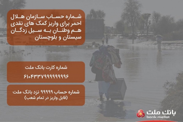 سازمان هلال احمر ایران از طریق شماره حساب ۹۹۹۹۹ بانک ملت، آماده دریافت کمک های نقدی به سیل زدگان مناطق جنوب و جنوب شرقی کشور به ویژه استان سیستان و بلوچستان است.