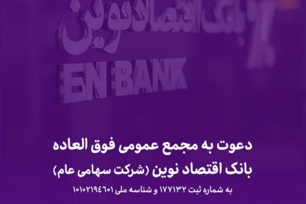مجمع عمومی فوقالعاده بانک اقتصادنوین (شرکت سهامی عام) رأس ساعت ۱۰ صبح روز دوشنبه مورخ ۱۳۹۹.۰۲.۲۲ در تهران، خیابان ولیعصر، بلوار اسفندیار، شماره ۲۴، ساختمان مرکزی بانک اقتصادنوین، طبقه دهم تشکیل میشود.