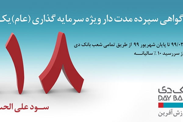 فروش اوراق گواهی سپرده مدتدار ویژه سرمایه گذاری ( عام) در بانک دی از روز شنبه 13 اردیبهشت ماه تا روز دوشنبه ۳۱ شهریورماه سال ۱۳۹۹، در تمامی شعب بانک دی، صورت خواهد پذیرفت.