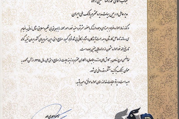در سومین دوره مراسم تجلیل از صادرکنندگان، فروشندگان و سایتهای تجارت الکترونیک برتر صنایع دستی کشور از محمدرضا حسینزاده مدیرعامل بانک ملی ایران تقدیر شد.