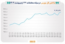 شاخص کل بورس در میانه مبادلات امروز، سهشنبه ۲۳ اردیبهشت ۱۴۰۴، به سطح ۳ میلیون و ۱۹۶ هزار و ۸۶۹...